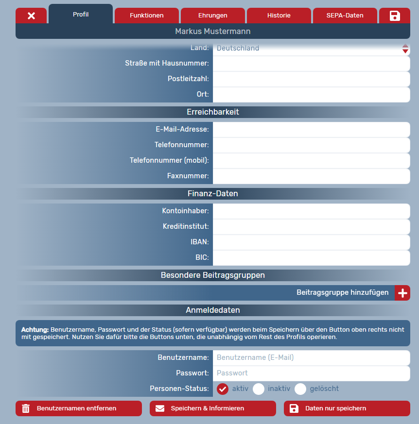 Ein:e Administrator:in eines Vereins kann weitere Administratoren/Administratorinnen für seinen Verein sowie für zughörige Ensembles ernennen, nicht jedoch für Kreis- und Mitgliedsverbandsebene.