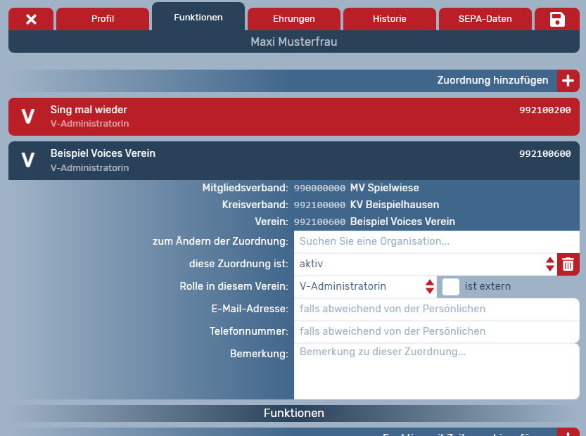 Beispiel: Ein:e Administrator:in eines Mitgliedsverbands kann für seinen/ihren Mitgliedsverband sowie für zugehörige Kreisverbände, Vereine und Ensembles weitere Administratoren/Administratorinnen ernennen.