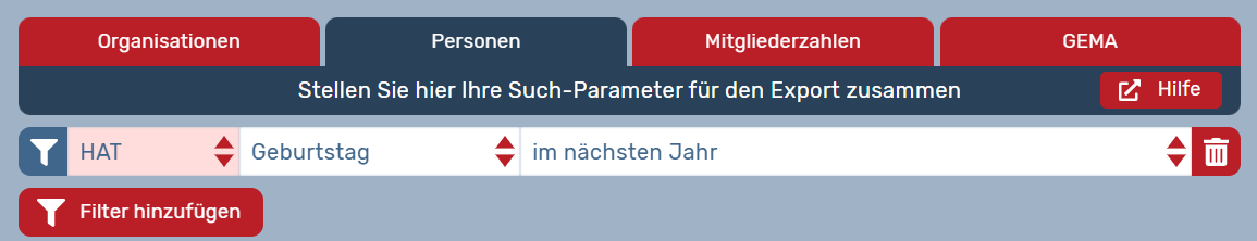 Sie können nun einen --> Filter hinzufügen, um damit nur nach bestimmten Kriterien ausgewählte Personen/Organisationen auf der Liste auszugeben. So können Sie sich z.B. nur beitragspflichtige Personen anzeigen lassen. Es können auch verschiedene Kriterien kombiniert werden (UND/ODER/UND NICHT). Auf dem Mülleimer-Symbol am Zeilenende können Sie einen Filter löschen.