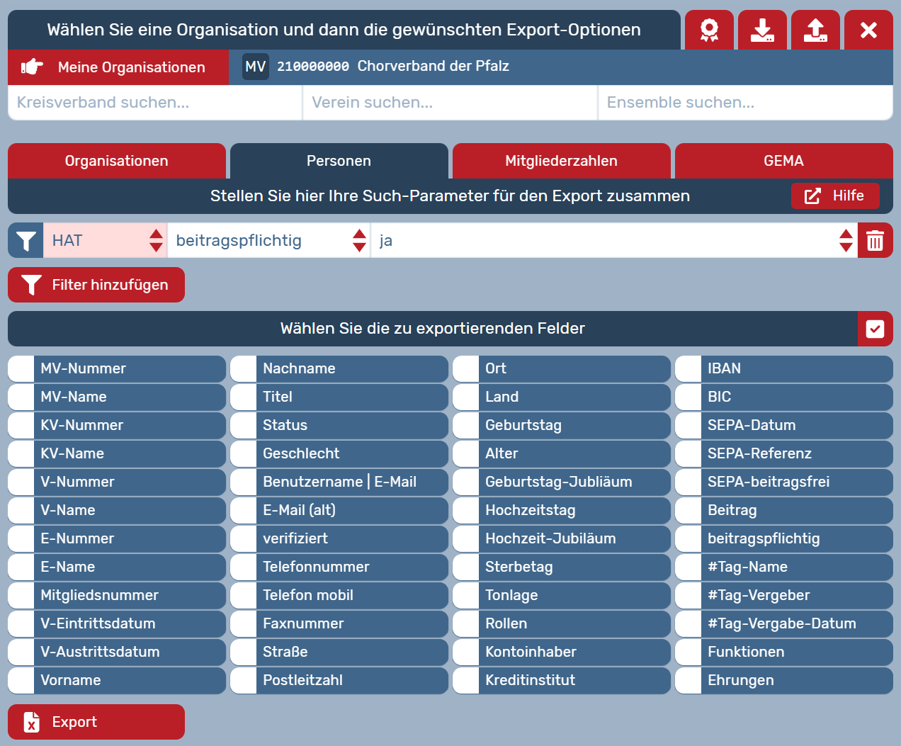 Personen: Zum Export aller Personen (entsprechend der Datenschutzeinstellungen) z.B. eines bestimmten Vereins oder eines Ensembles in einem Verband.