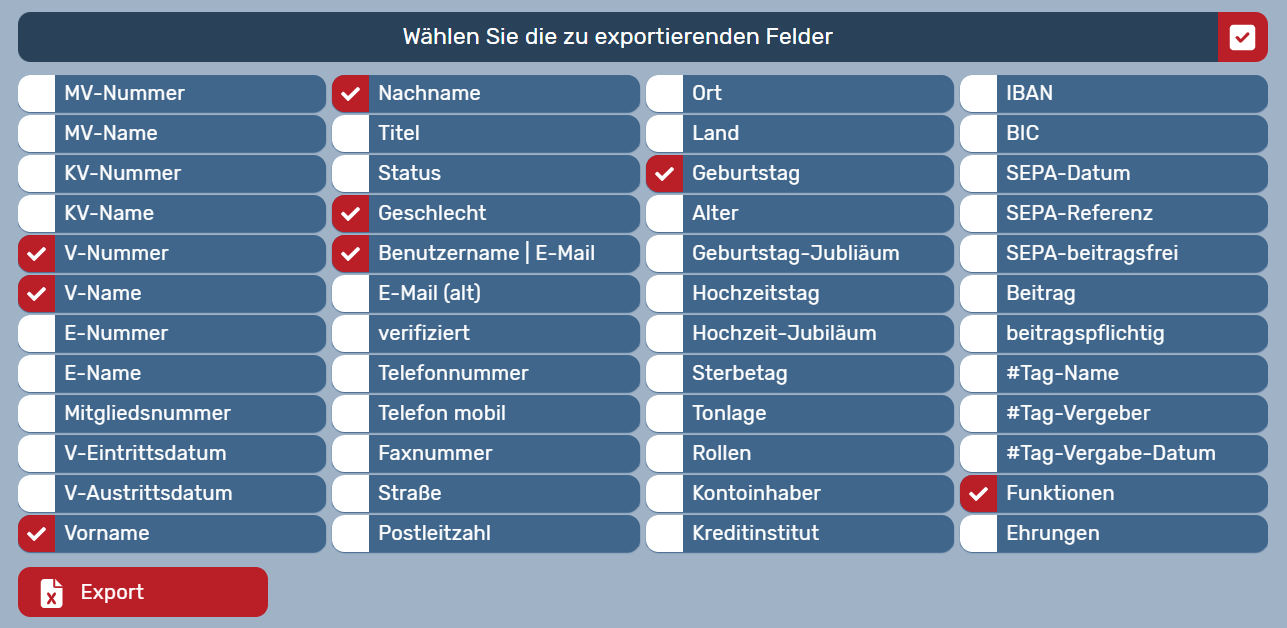 Im unteren Bereich klicken Sie alle Felder an, die Sie exportieren möchten. Sie können mit dem Haken rechts oberhalb der Liste alle Felder gleichzeitig aus- oder abwählen. Die Auswahl können Sie auch speichern, um sie beim nächsten Mal nicht erneut einstellen zu müssen (siehe unten). Beispiel-Felder im Personen-Reiter: