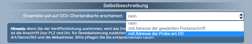 Auf Ensembleebene muss auf den Reiter -> Daten navigiert werden und dort in der Eingabemaske unter der Überschrift „Selbstbeschreibung“ eine Adressauswahl bei „Ensemble soll auf DCV-Chorlandkarte erscheinen“ getroffen werden.