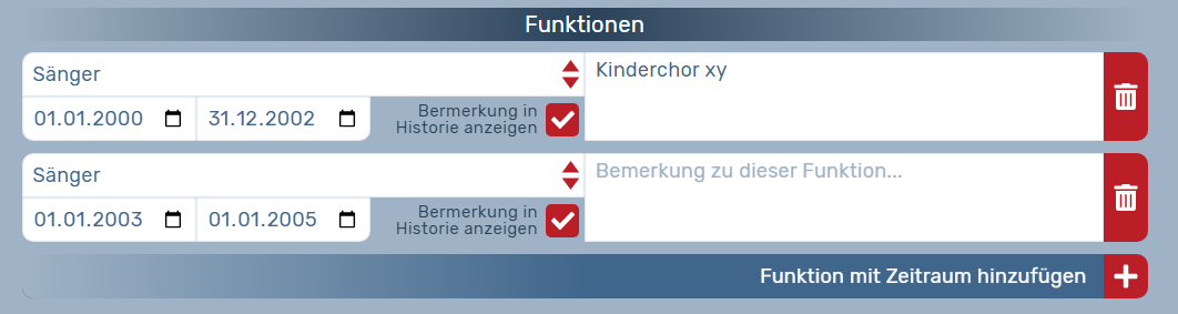 Fügen Sie bei der betreffenden Person einen neuen Zeitraum mit der Funktion Sänger:in bzw. Chorleiter:in im aktuellen Ensemble, aber mit in der Vergangenheit liegendem Start- und Enddatum, hinzu und tragen Sie im Bemerkungsfeld den bzw. die Chornamen des/der betreffenden Ensemble(s) ein. Es ist dabei unerheblich, ob diese(s) Ensemble(s) Mitglied im DCV sind/waren, da dies für die Auszeichnung irrelevant ist. Wichtig ist lediglich die DCV-Mitgliedschaft zum Zeitpunkt des Jubiläums. Wenn die Bemerkung in der Historie der Person angezeigt werden soll, klicken Sie die entsprechende Checkbox an. Bei überlappenden Funktionszeiträumen einer Funktion, muss eine der Funktionen über die Feldbezeichnung "sonstige Funktionen" definiert und dann genauer benannt werden.