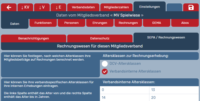 Wählen Sie zunächst aus, ob für die Beitragsrechnungen Ihre verbandsinternen Altersklassen oder die DCV-Altersklassen die Grundlage bilden sollen. Die DCV-Beiträge berechnen sich in den Kategorien Mitglieder in Kinderchören und Mitglieder in Erwachsenenchören.