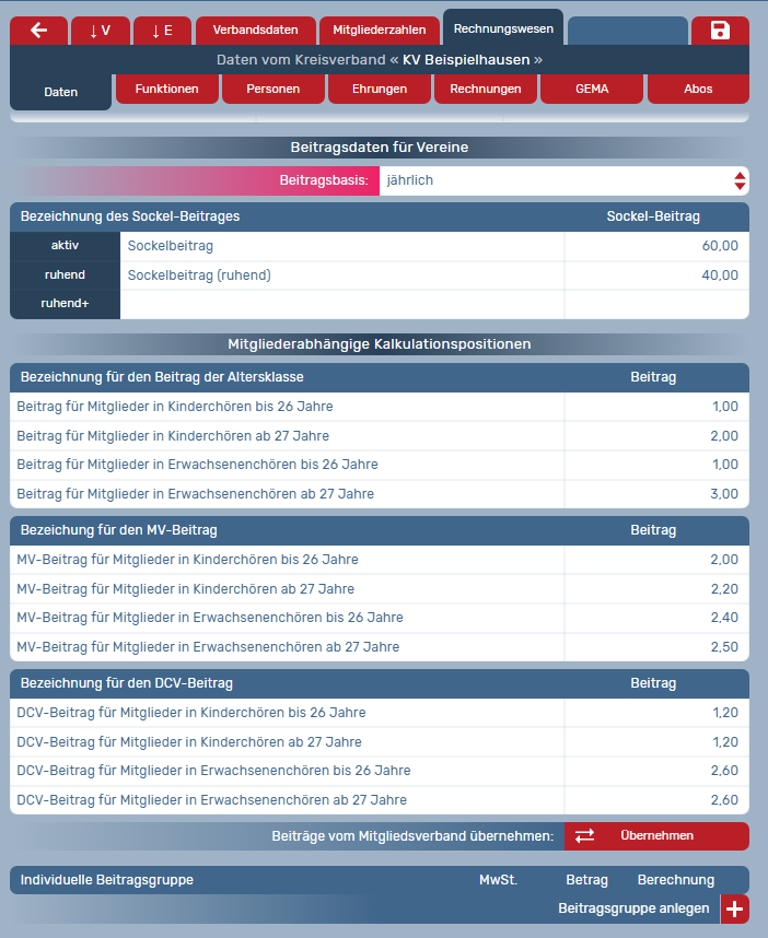 Diese Beiträge selbst können individuell für aktive, ruhende oder ruhend+ gekennzeichnete Kreisverbände/Vereine definiert werden. Bitte denken Sie daran, den Beitragssatz je Verein des DCV-Mitgliedsverbandes laut gültiger DCV-Beitragsordnung bei der Summe des Vereinsbeitrags mit dazu zu rechnen.