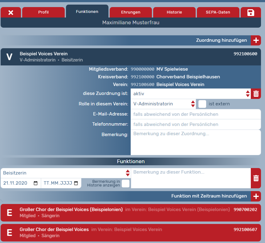 Wichtig: Die Funktionen Sänger:in sowie Chorleiter:in können nur auf Ensemble-Ebene angelegt werden, da es nur dort diese Person geben kann. So wird auch die korrekte Mitgliedsberechnung und die Ehrungslogik sicher gestellt.