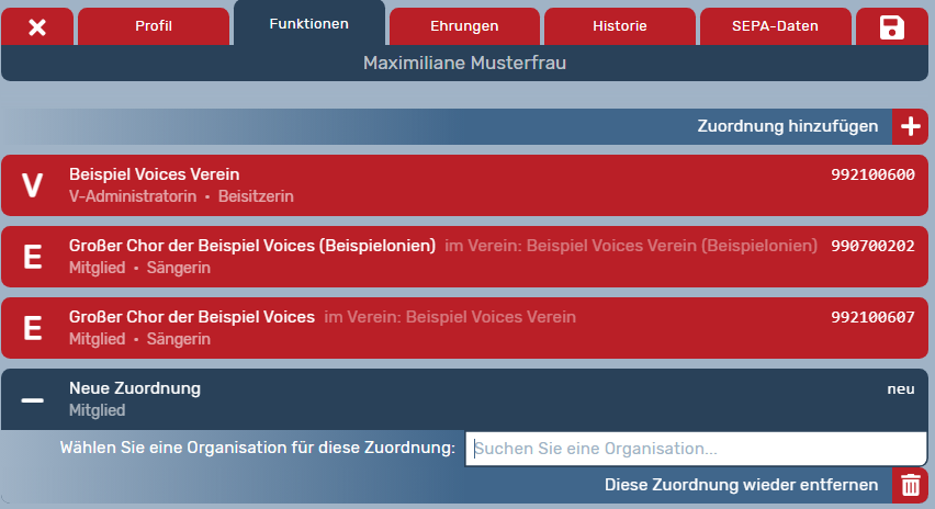 Wenn im Profil der Person unter dem Reiter "Funktionen" die Organisation, in der die Person eine Funktion einnehmen soll, noch nicht vorhanden sein sollte, klicken Sie im Reiter "Funktionen" zunächst auf -> Zuordnung hinzufügen (Plussymbol oben rechts), um die Person mit einer neuen Organisation zu verknüpfen, zum Beispiel existiert die Person schon auf Vereins-Ebene, aber noch nicht auf Ensemble-Ebene (z.B. mit der Funktion Sänger:in).
