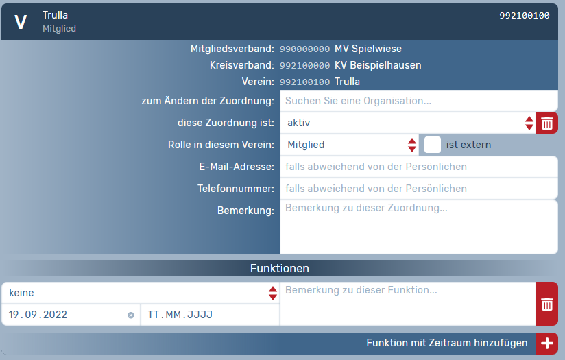 Beispiel: Der Vorsitzende eines Vereins ist zukünftig auch auf Kreisverbandsebene als Administrator aktiv oder ein Vereinsmitglied ist neuerdings auch in einem anderen Verein Mitglied.
