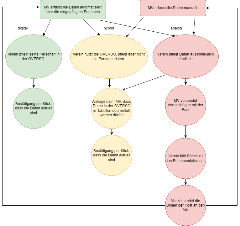 Hinweis: Es besteht immer die Möglichkeit, dass der MV in die Datenerfassung unterstützend eingreift und beispielsweise die Personendaten selbst in OVERSO pflegt, während der Verein die Vereinsbögen analog bearbeitet. Darüber, welche Möglichkeiten die Vereine haben, entscheidet der jeweilige Mitgliedsverband.