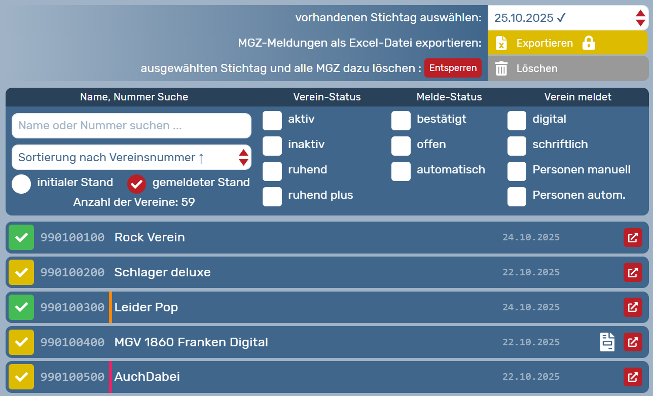 Mit gelbem Haken werden nach endgültigem Beenden der MGZ diejenigen Vereine dargestellt, die nicht gemeldet haben und deren gemeldeter Stand daher automatisch mit dem initialen Stand befüllt wurden (Melde-Status: automatisch).