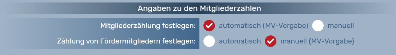 Der MV-Admin kann dazu auf Vereinsebene unter dem Reiter "Daten" / "Mitgliederzahlen" bei "Mitgliederzählung festlegen:" von "automatisch" auf "manuell" umstellen: