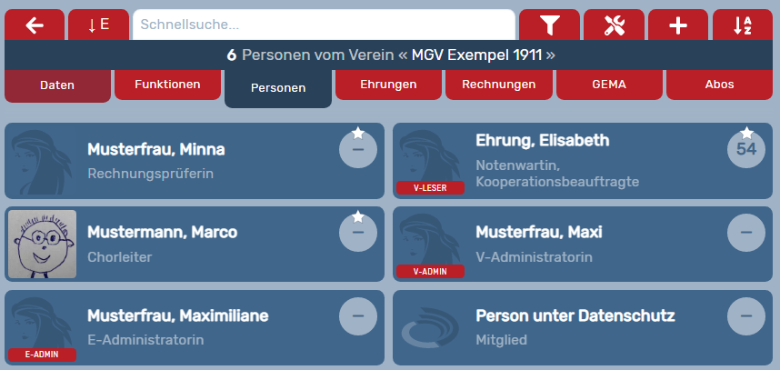 DCV-Abrechnungsdaten: Es werden alle Personen eines Vereins gezählt, die als aktives Mitglied einem Ensemble zugeordnet sind (auch E-Administrator:innen und E-Leser:innen), bei denen das Häkchen nicht auf "ist extern" steht und der Benutzerstatus der Person aktiv ist und die mindestens eine Funktion mit nicht beendetem Zeitraum innehaben (Ausnahme "Fördermitglied").