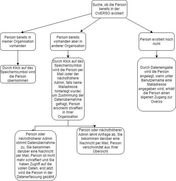 Person können auf zwei Wegen von einer anderen Organisation "übernommen" (bzw. dieser zugeordnet) werden. Voraussetzung ist, dass für die Person ein Benutzername (also eine Emailadresse) hinterlegt ist, denn bei jeder Übernahme-Anfrage wird eine Mail an die Person geschickt, die übernommen werden soll, in der die Person binnen 3 Wochen der Übernahme-Anfrage zustimmen oder diese ablehnen kann.