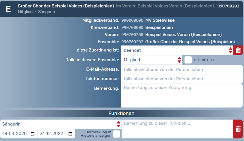 Hinweis: Es existiert für jede Person in der OVERSO genau ein Datensatz. Wenn eine Person z.B. in mehreren Ensembles Mitglied ist oder verschiedene Funktionen auf verschiedenen Ebenen ausübt und Sie Änderungen vornehmen, werden diese Änderungen überall angezeigt. Sie haben aber die Möglichkeit, für einzelne Funktionen (z.B. für den Vorstand) eine besondere E-Mail-Adresse oder Telefonnummer zu hinterlegen. Nutzen Sie dafür die entsprechenden Felder im Reiter --> Funktionen.
