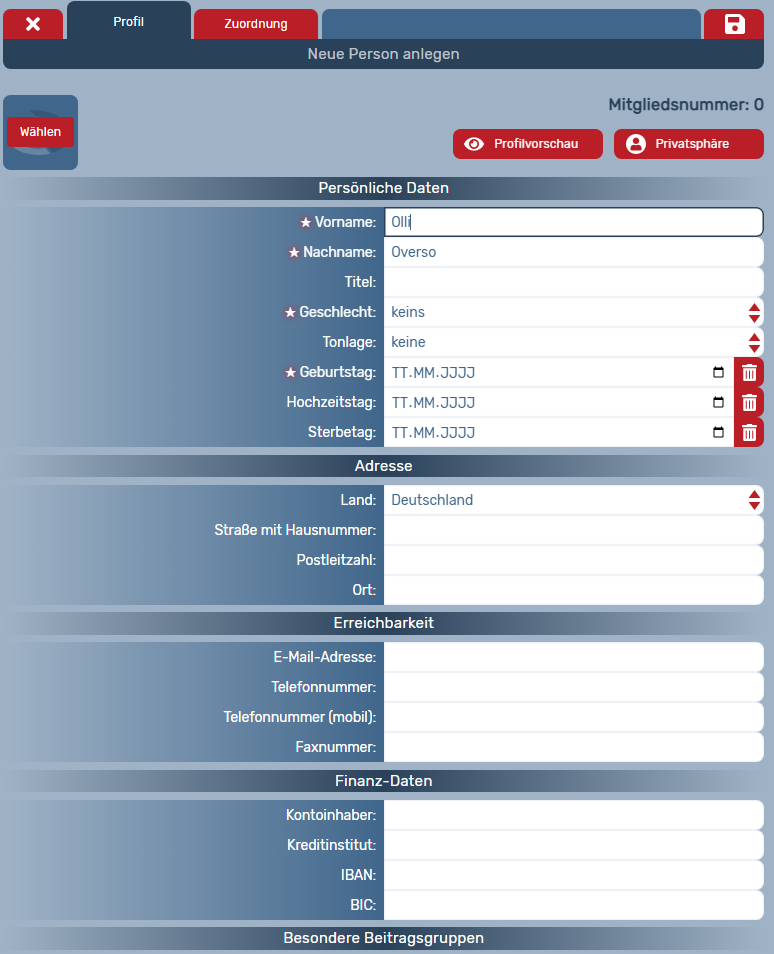 Sie erhalten dann eine leere Bearbeitungsmaske, die Sie nun ausfüllen können. Pflichtfelder sind mit einem kleinen Stern gekennzeichnet und müssen alle ausgefüllt werden, damit die Person gespeichert werden kann und von OVERSO vollumfänglich erfasst wird (zum Beispiel bei der statistischen Datenerfassung oder dem Ehrungswesen).