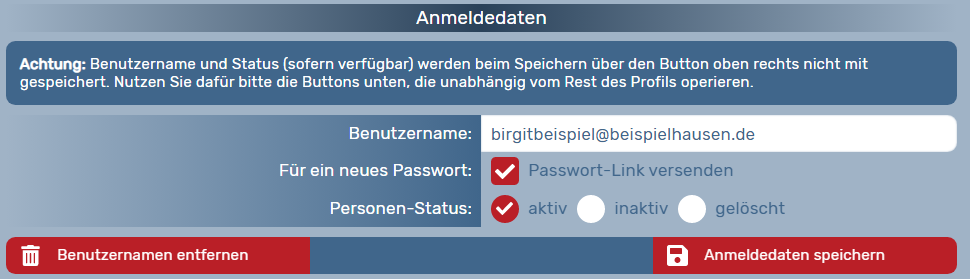 Wenn die Person einen eigenen Zugang zu ihren Daten bzw. zur OVERSO bekommen soll, muss ganz unten unter "Anmeldedaten" im Feld "Benutzername" eine E-Mailadresse dieser Person hinterlegt werden. AnschließendDurch kanndas durch Anklicken der Checkbox "Passwort-Link versenden"Hinterlegen und mitSpeichern Klickerhält aufdie "AnmeldedatenPerson speichern"dann automatisch eine E-MailEmail anvon die eingetragene Adresse versendet werden,OVERSO mit der der NutzerMöglichkeit, /ihr Profil zu bestätigen und sich anzumelden. Nachdem die NutzerinPerson eigenständigin dasder Email auf den Button "Jetzt anmelden" geklickt hat, hat sie die Möglichkeit, ein eigenes Passwort ändernfestzulegen (bitte die Vorgabe zu zulässigen Sonderzeichen beachten) und kann (ggf.sich denanschließend SPAM-Ordnermit überprüfen!).ihrer Achtung:E-Mail-Adresse Dieseund Felder werden erst nach dem erstmaligen Speichern der Kontaktdaten sichtbar.