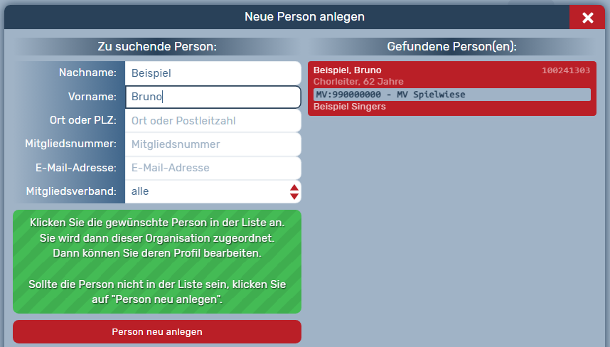 Hinweis: Eine Person wird immer auf der Ebene (MV, KV, V, E ) hinzugefügt, auf der Sie sich aktuell befinden. Damit Personen bei der automatisierten Bestandserfassung gezählt werden, müssen Sie auf Ensembleebene als Sänger:in eingetragen werden, da das System Sie erst dann als beitragspflichtig erkennen kann.