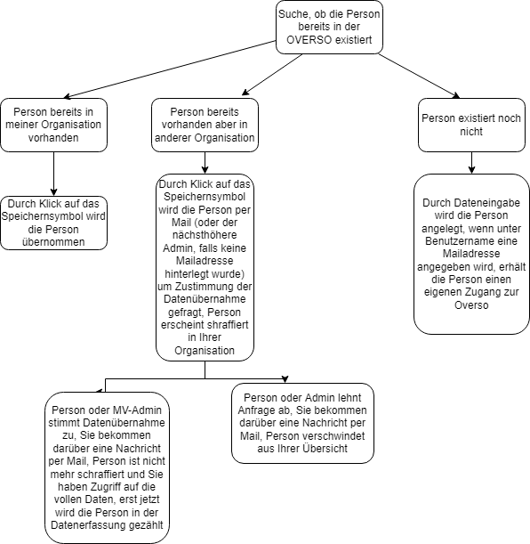 Wenn die Person bereits in der OVERSO vorhanden ist, z.B. weil sie bereits in einem anderen Ensemble Mitglied ist, können Sie die Person auch zu Ihrer Organisation hinzufügen. Dazu klicken Sie in der Liste der gefunden Personen rechts einfach auf den entsprechenden Eintrag und anschließend oben rechts auf --> Speichern. Die Person oder - falls für die Person keine Mailadresse hinterlegt wurde - der Administrator erhält dann eine E-Mail, in der die Zustimmung dafür beantragt wird. Solange ist diese Person nur vorläufig Ihrer Organisation zugeordnet (erkennbar durch dunkle Quer-Streifen). Wenn diese E-Mail beantwortet wird, erhalten Sie eine Nachricht. Wurde zugestimmt, wird die Zuordnung aktiviert und somit ist die Person Ihrer Organisation wie gewünscht zugewiesen. Erst dann können Sie die Daten einsehen und bearbeiten. Wurde abgelehnt, wird die Zuordnung gelöscht.
