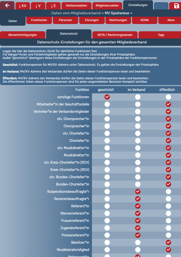 Administrator:innen von Mitgliedsverbänden können unter --> Daten --> Einstellungen --> Datenschutz spezifische Einstellungen zur Sichtbarkeit von Daten je nach eingestellter Funktion im Profil für Ihren Mitgliedsverband vornehmen:
