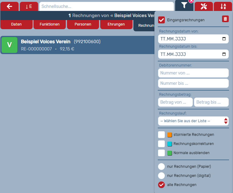 Der --> Filter (Trichter-Symbol rechts oben neben dem Suchfeld) ermöglicht das Filtern nach Rechnungsdatum, Debitorennummer (entspricht der Mitgliedsnummer), Rechnungsbetrag, Rechnungslauf. Außerdem können Sie sich Eingangsrechnungen, d.h. Rechnungen, die Sie selbst erhalten haben, anzeigen lassen. Ebenso können Sie auch stornierte oder korrigierte Rechnungen mit anzeigen lassen. Unten können Sie auswählen, dass Sie nur die Rechnungen anzeigen lassen, die in Papierform zugestellt werden sollen, z.B. um sie in einer Sammelaktion auszudrucken.