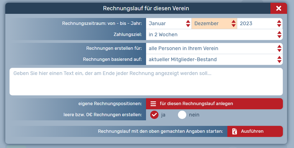 Sie haben an dieser Stelle außerdem die Möglichkeit, zusätzliche Rechnungspositionen zu definieren und Sie können entscheiden, ob auch 0-Rechnungen für beitragsfreie Personen erstellt werden sollen.