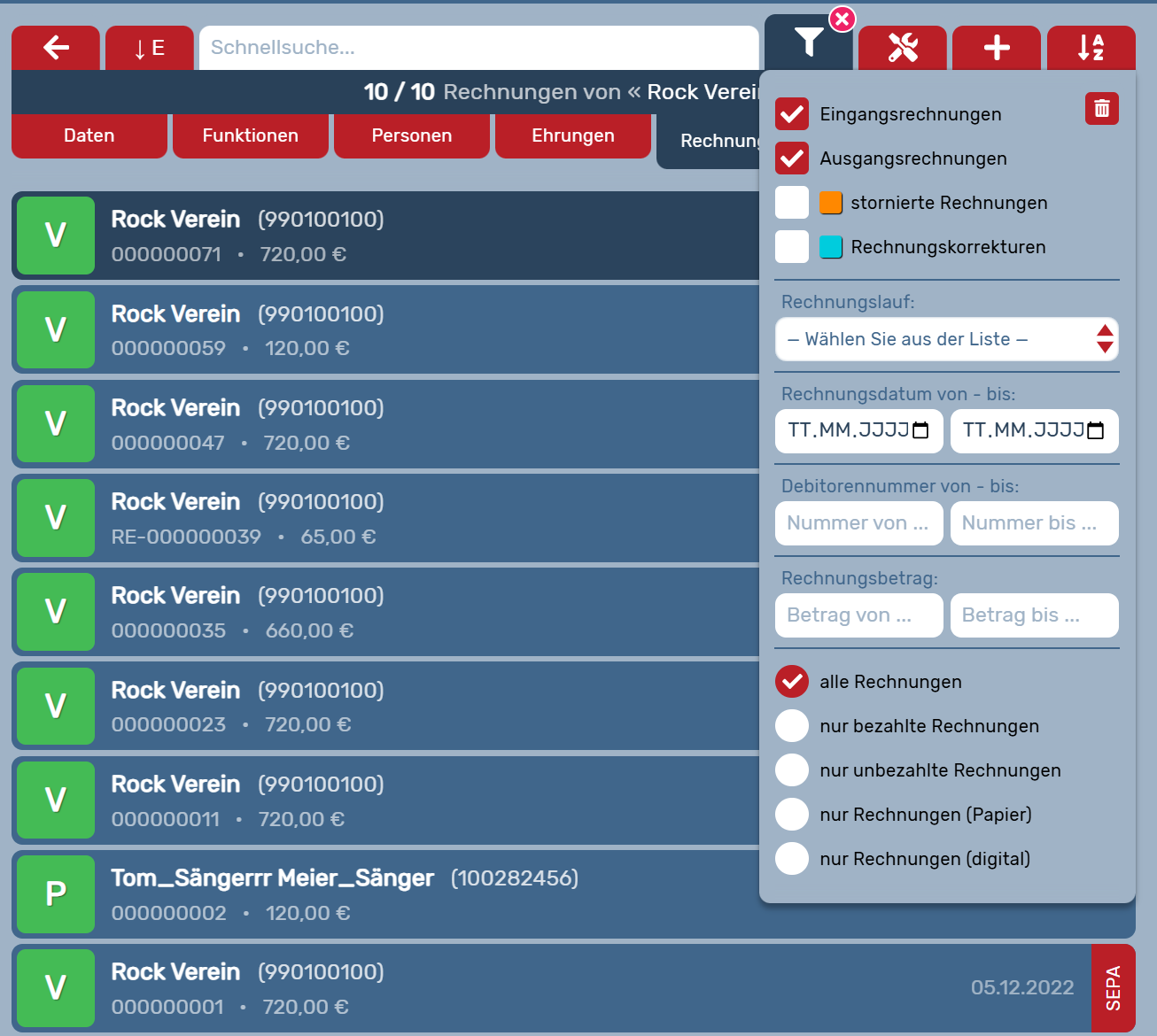 Vereine können unter dem Reiter „Rechnungen“ Rechnungen aufrufen, die sie von ihrem Kreisverband erhalten haben. Über den Filter-Button oben (Trichter-Symbol) können Sie nach Eingangsrechnungen oder Ausgangsrechnungen filtern.