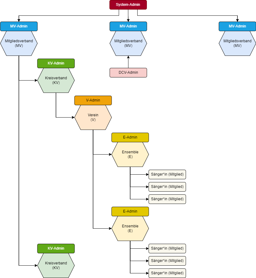 Beispiel: Der Administrator eines Kreisverbandes kann die Daten seines Kreisverbands sowie der zugehörigen Vereine und Ensembles bearbeiten. Umgekehrt kann ein Administrator eines Ensembles natürlich nicht die Daten der darüber liegenden Ebenen wie Verein oder Kreisverband bearbeiten.