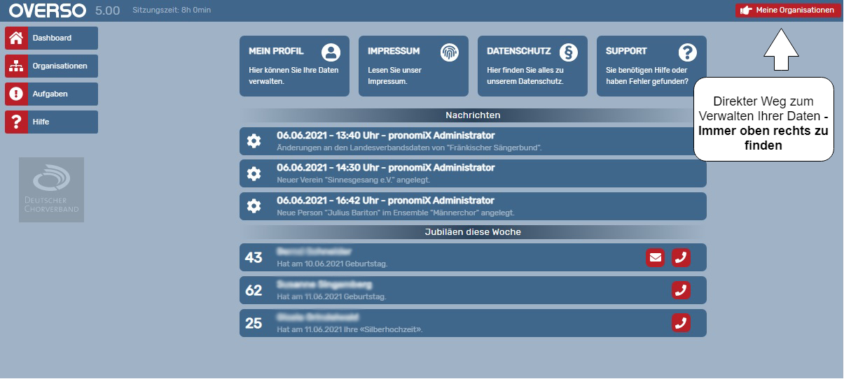 Auf der Startseite, dem sogenannten Dashboard, können Sie sich einen Überblick über zentrale Mitteilungen und anstehende Jubiläen verschaffen.